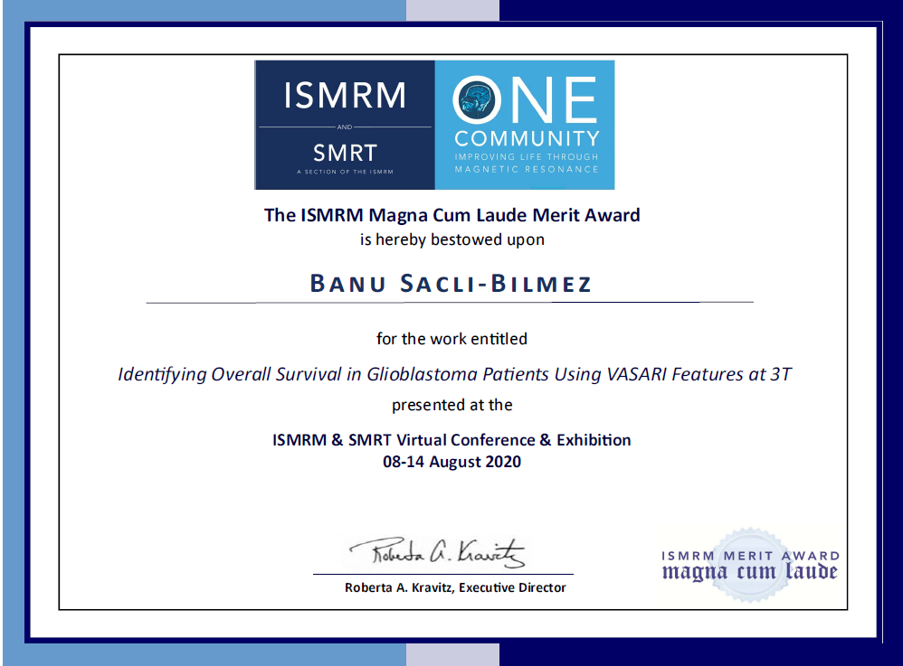 The abstract entitled 'Identifying Overall Survival in Glioblastoma Patients Using VASARI Features at 3T' presented by Banu Saçlı Bilmez received the ISMRM Magna Cum Laude Merit Award.
