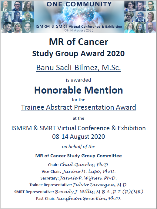 The abstract entitled 'MR Spectroscopic Differences of Low and High Grade TERTp-only Gliomas' presented by Banu Saçlı Bilmez was selected as a trainee competition finalist by the ISMRM MR of Cancer Study Group.